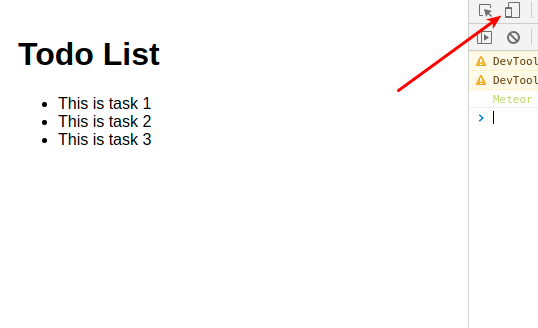¥At this point meteor should be running on port 3000 so you can visit the running app and see your list with three tasks displayed at http://localhost:3000/ - but if meteor is not running, go to your terminal and move to the top directory of your project and type meteor then press return to launch the app.
