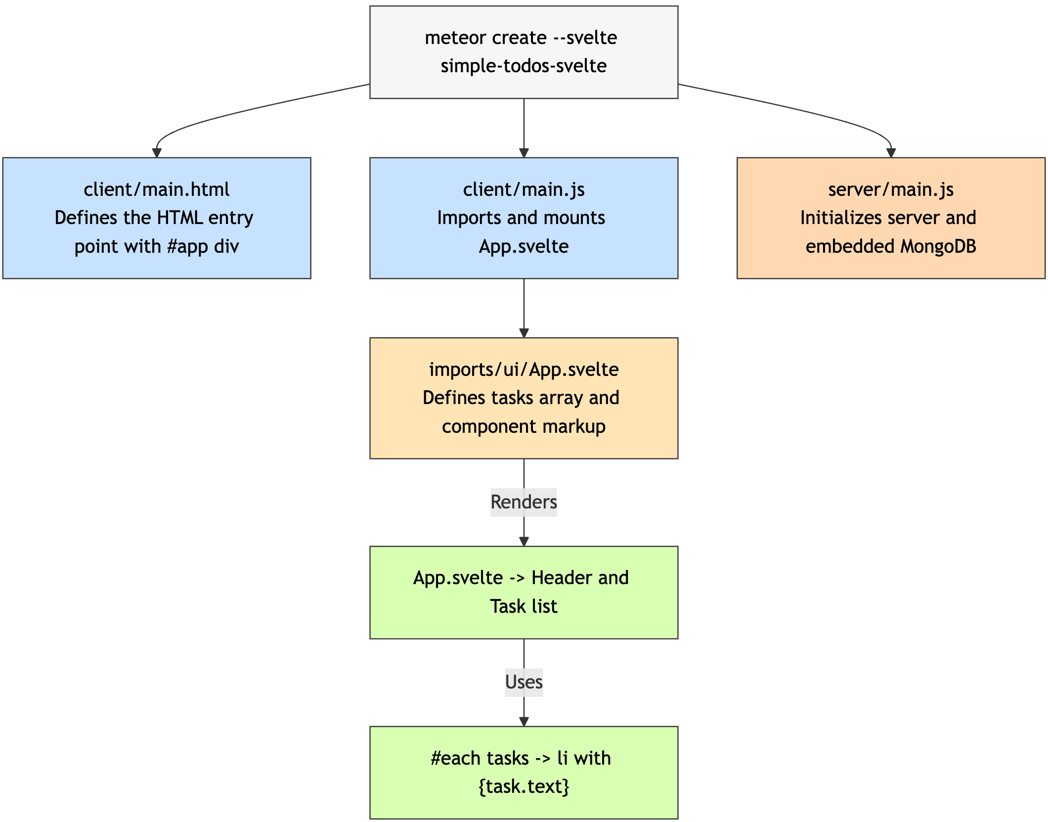 ¥In Svelte with Meteor, your main entry point is client/main.js, which imports and mounts your root Svelte component App.svelte to a target element in the HTML like <div id="app"></div>